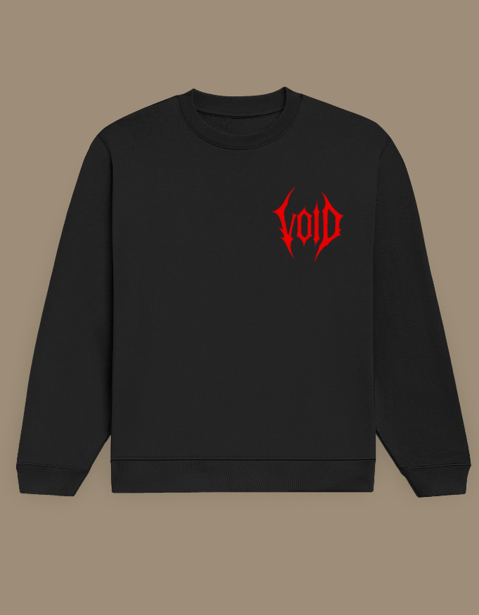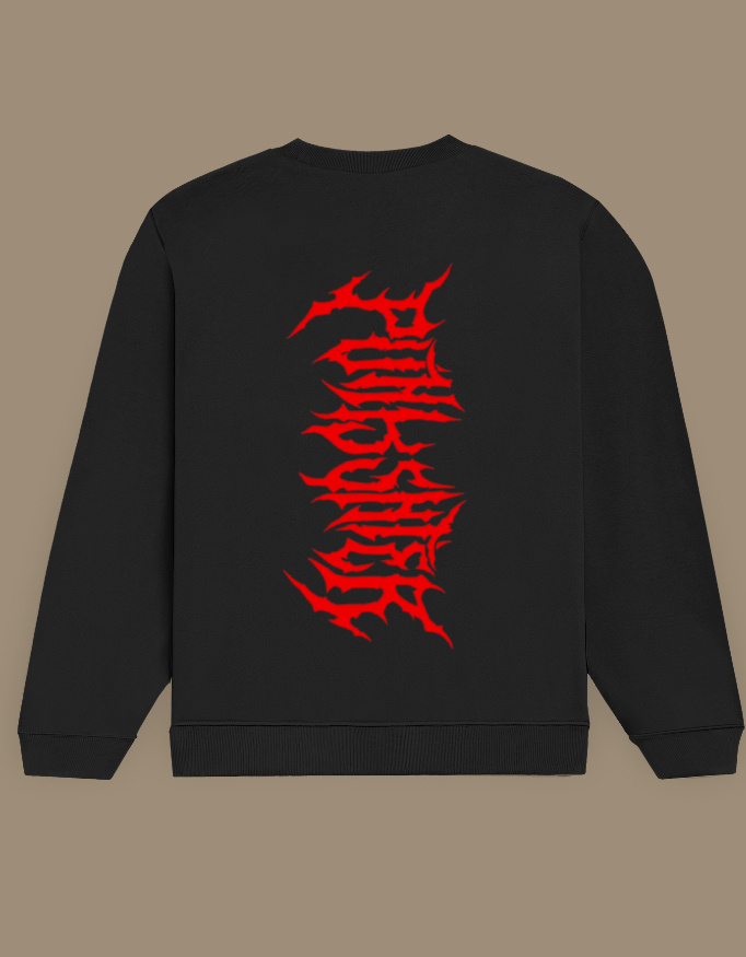 Bold red gothic typography on a deep black canvas—minimal in the front, loud in the back. Made for nights that never end, and energy that never fades.